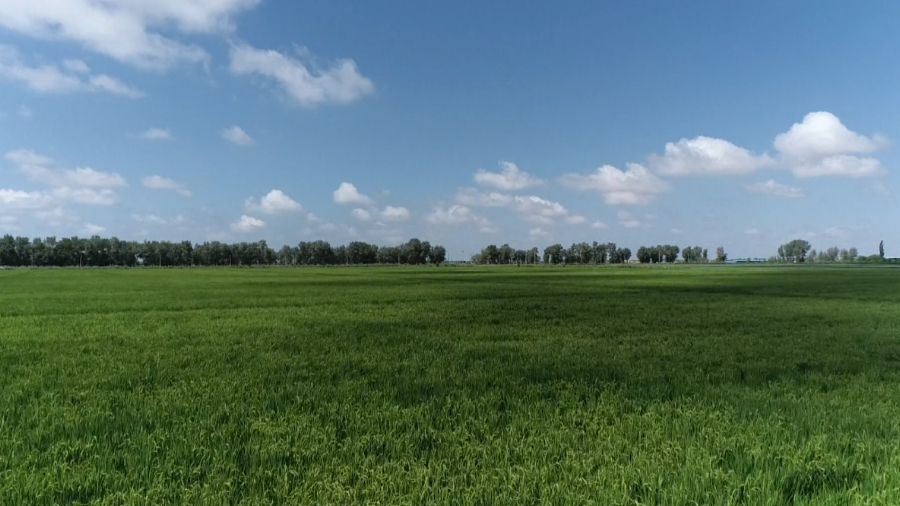 时下,从空中俯瞰阿拉尔市金色沙垦农业发展有限公司位于新疆生产建设兵团第一师阿拉尔市十三团幸福镇的羊脂籽米种植基地,大地犹如铺上了绿地毯,稻秧随风摇曳,泛起细细的绿浪,美不胜收。