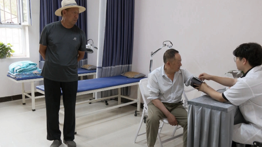 在社区老年人日间照料中心理疗室,医务人员为老人量血压。潘许摄