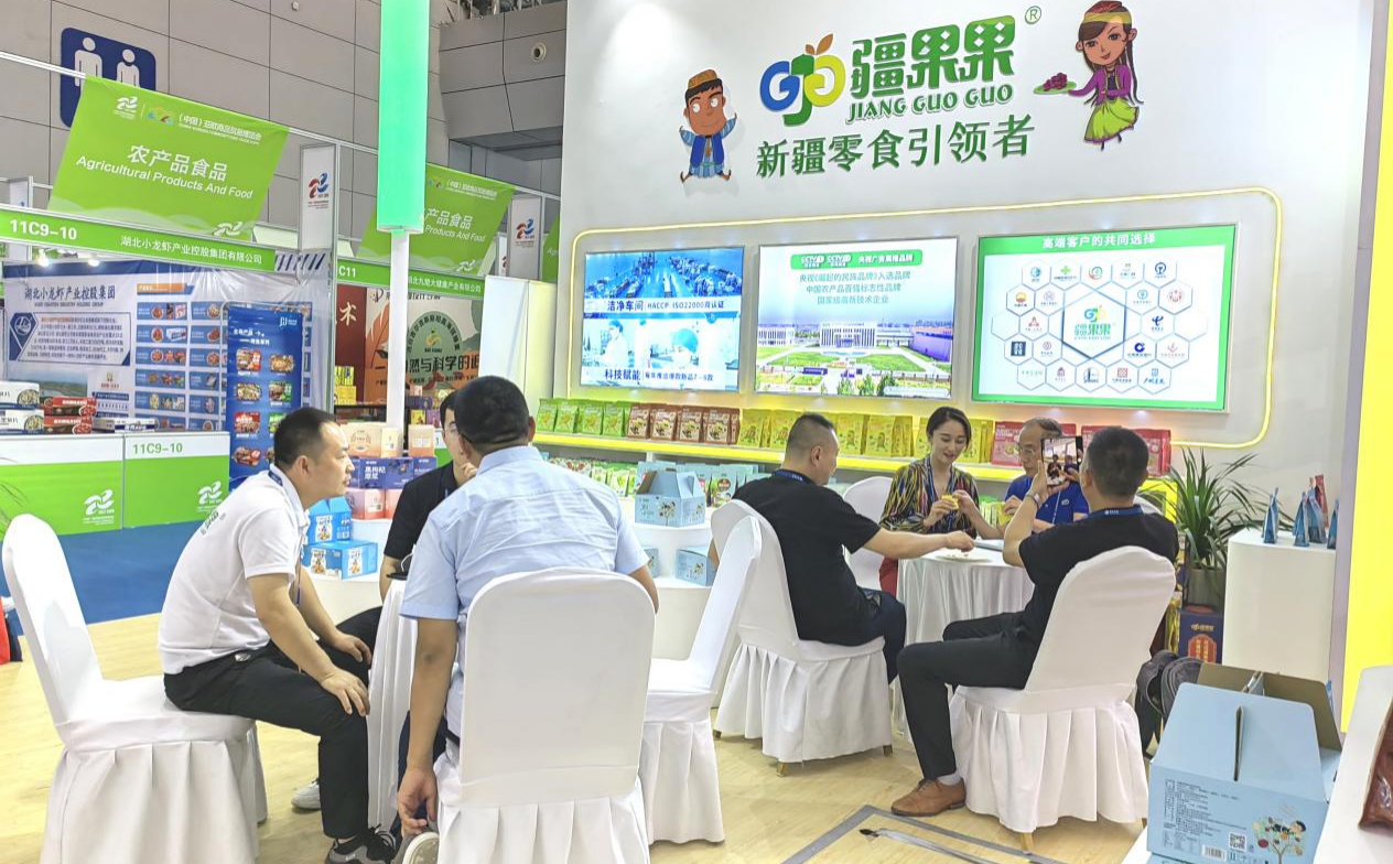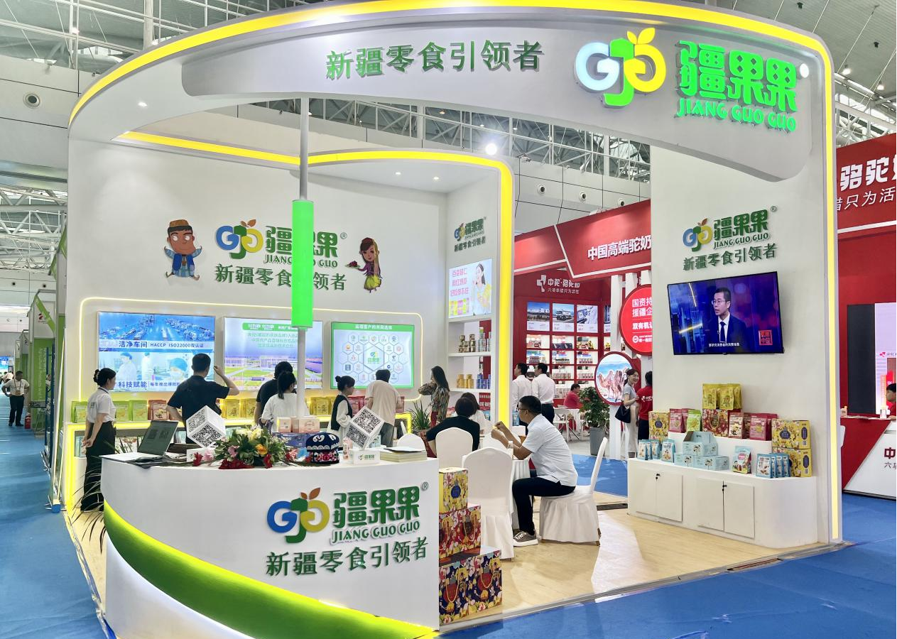 疆果果作为喀什地区的明星企业在商博会上大放异彩,为全面展示品牌形象特设疆果果企业特装形象展厅,整体布展采用半开放式空间设计,实现了展示、互动、交流三大场景服务,展厅的外观和内饰都非常优雅高端,吸引了众多商客驻足参观、品尝、交流。