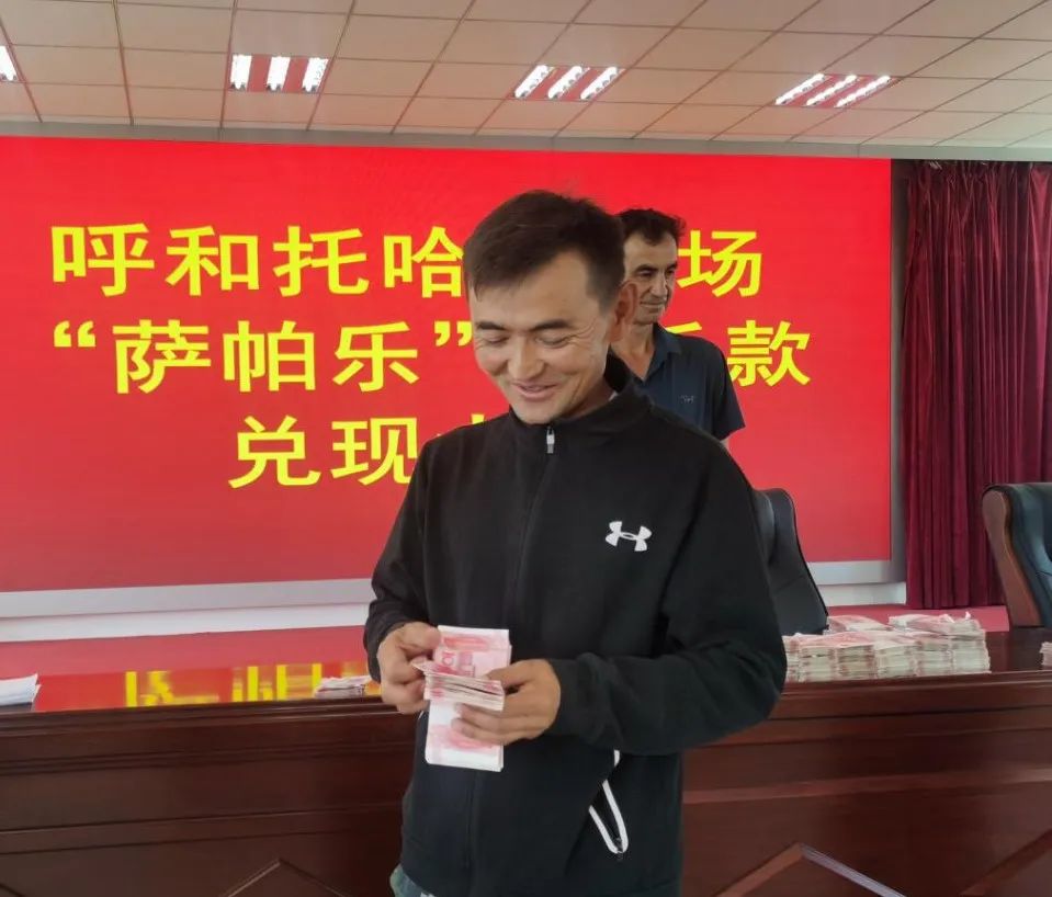 被喊到名字的确肯布勒格队养殖户叶斯布拉提·肖吉汗迈着轻快的步伐,兴高采烈的接过工作人员递上的羊毛款,高兴激动的说:“今年,政府通过多方询价、议价,每公斤羊毛比去年多卖了1.5元,我家比去年多收入5000元,对我们来说是好事、喜事,非常感谢他们。”