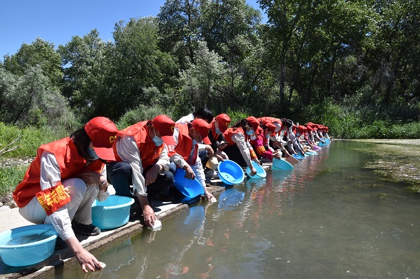“鱼宝宝,快游吧,一定多多生儿育女哈!”2023年6月6日,吉林台公司40名志愿者沿着喀什河两岸,将20万尾通过人工繁育的新疆裸重唇鱼苗缓缓放入河中。