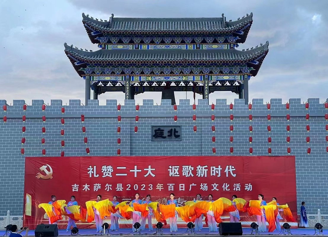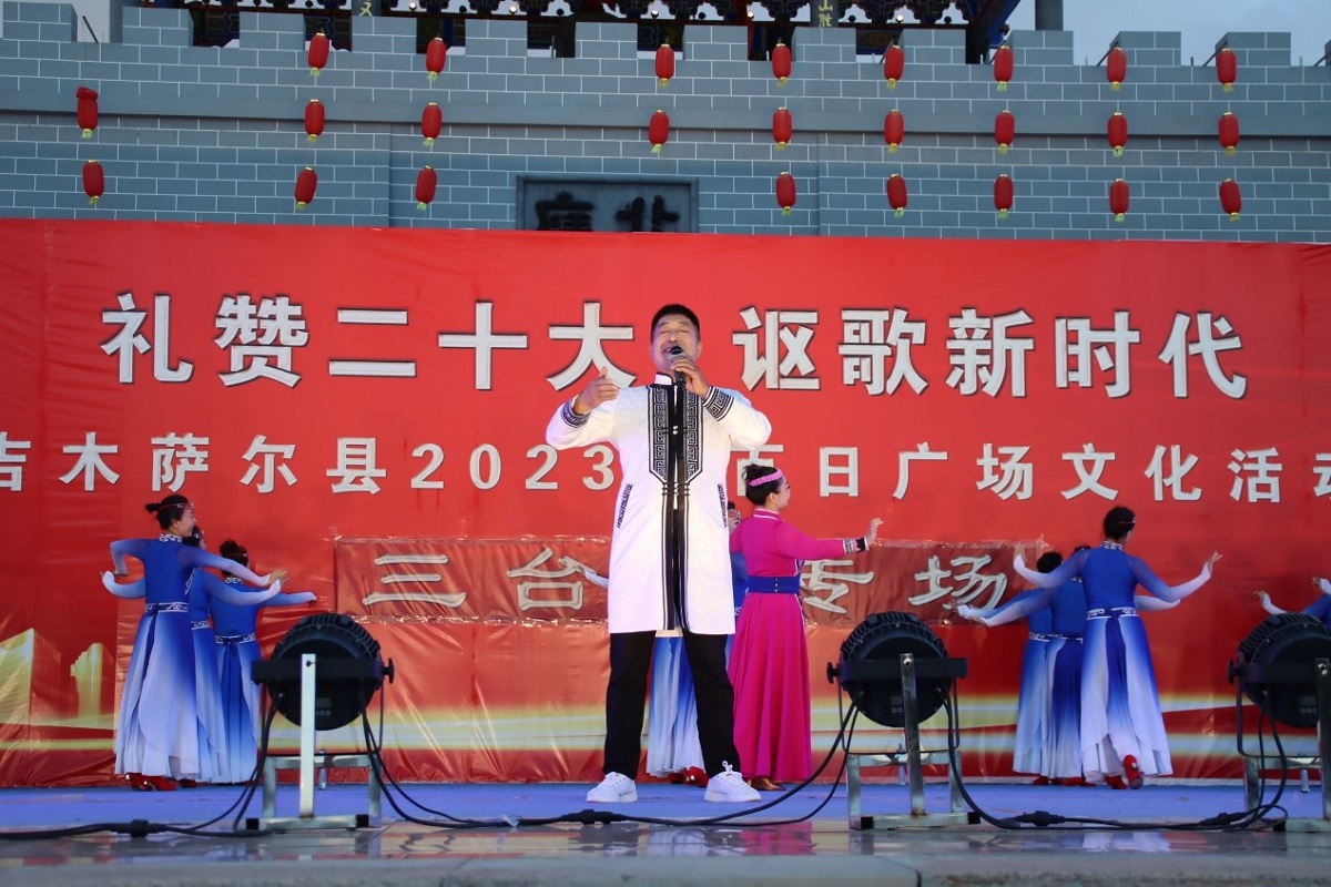 7月11日,新疆维吾尔自治区昌吉回族自治州吉木萨尔县在北庭园广场开展以“礼赞二十大,讴歌新时代”为主题的百日广场文化三台镇专场活动。各族干部群众载歌载舞,歌颂党、歌颂祖国、赞美家乡,共话北庭。