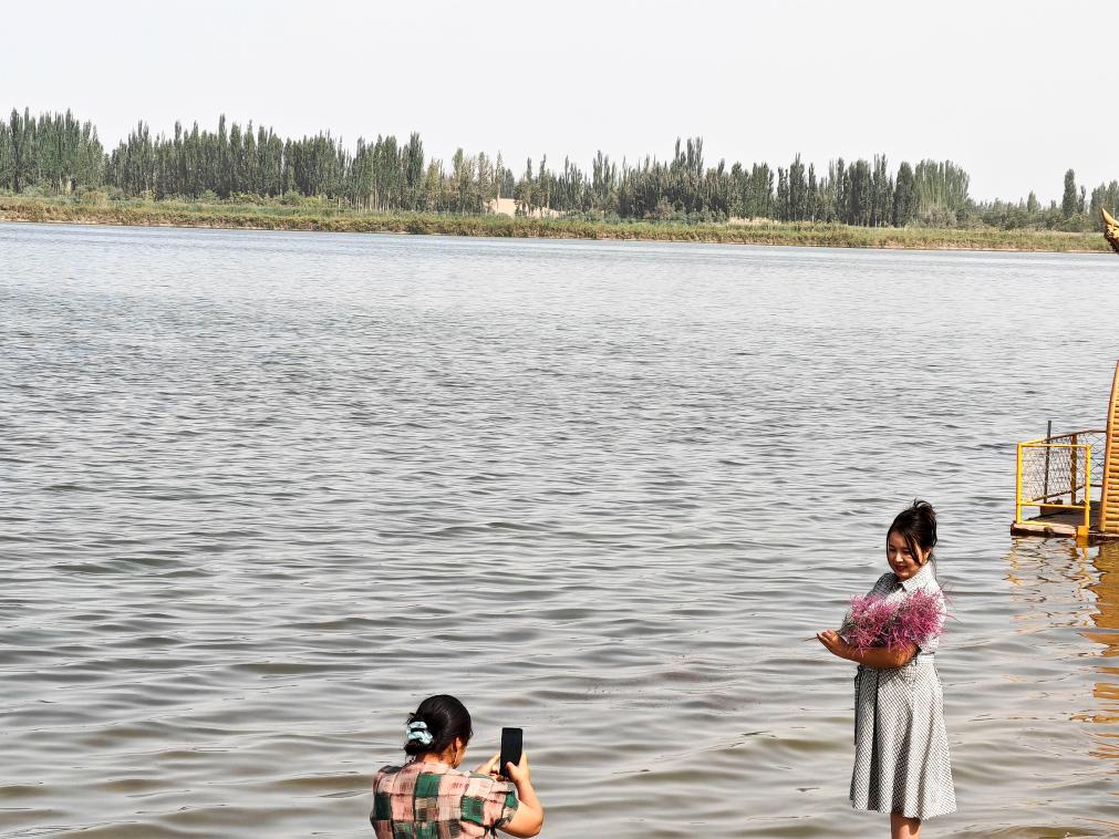 9月7日,游客在新疆拉里昆国家湿地公园拍照。新华社记者 苟立锋 摄