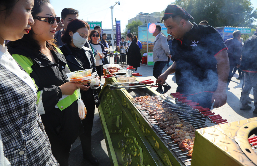 美食展示展销区内,高白鲑鱼宴、烤全羊、红柳烤肉、黑小麦凉面……各个摊位前人头攒动,摩肩接踵,美味小吃品种俱全,特色鲜明。各式各样热辣的烧烤让人忍不住垂涎三尺;精致可爱的糕点、点心让人爱不释手。各乡镇场的摊位生意都非常红火,各类美食尽显各自技艺,以可口的味道、独特的风味迅速赢得了居民、游客的青睐。