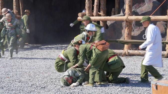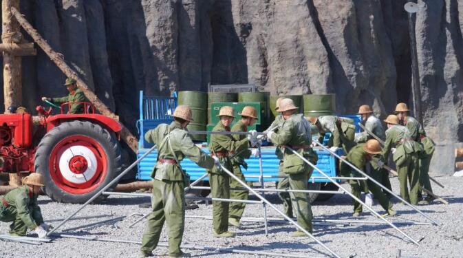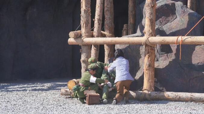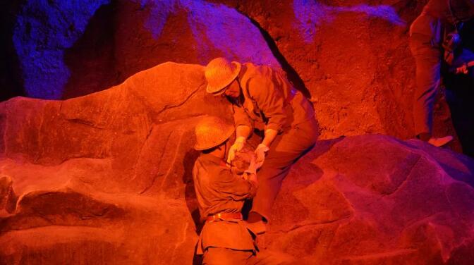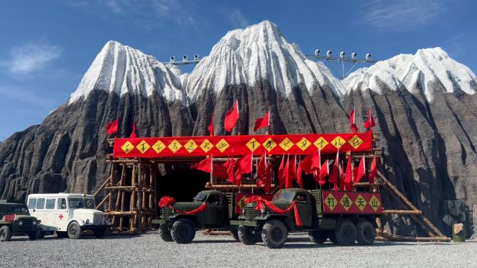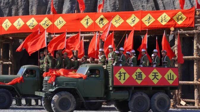 9月18日,工作人员在《独库天路》大型实景剧的排练现场看到,场内戴着大红花的老式绿头解放卡车、吉普车来回穿梭,高处的山上、昏暗的隧洞中到处可见身着老式军装、头戴藤编安全帽的学生演员,所有演员都在导演的指挥下情绪饱满、动作到位地排练,仿佛置身于当时修建独库公路的艰难岁月中。