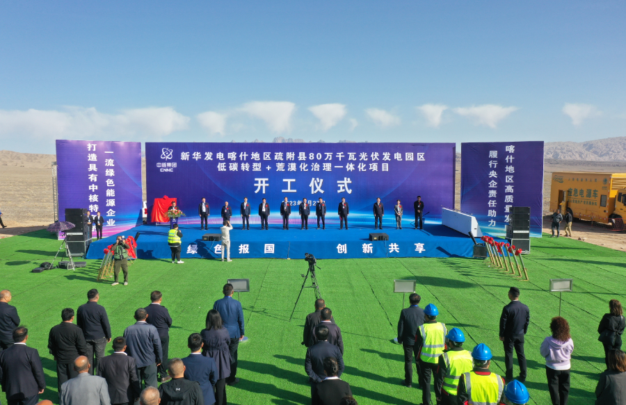 9月27日,总投资37.5亿元的新华发电疏附县80万千瓦光伏发电园区低碳转型+荒漠化治理一体化项目在疏附县木什乡光伏发电基地开工。
