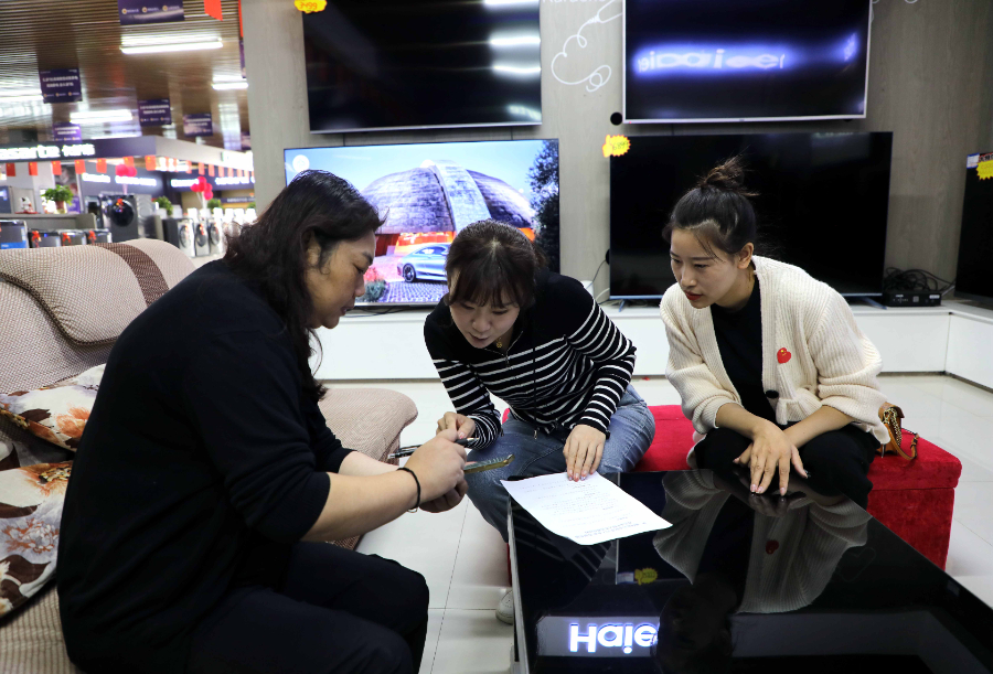 第一师阿拉尔市商务局工作人员帮助家电销售商进行申报。林国强摄