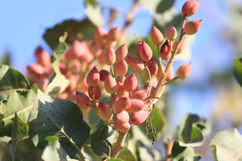 在新疆天一盛禾现代农业发展有限公司种质资源圃,一排排果树罗列整齐,一簇簇果实压弯了枝稍,粉红色的果实在绿叶间分外妖娆。农户们在林间来回穿梭,脸上洋溢着丰收的喜悦。一颗颗新鲜的开心果静卧筐中,等待搭乘飞机前往北上广。