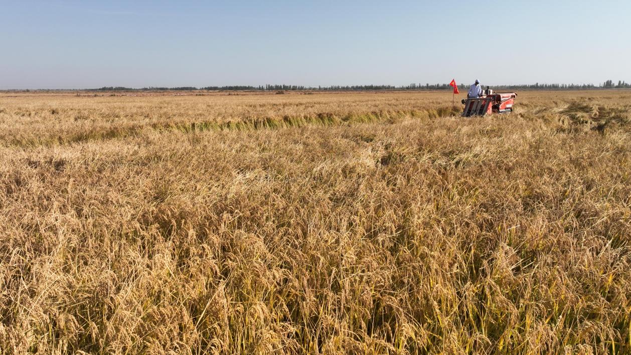 10月13日,工作人员收割水稻。冯斌 摄