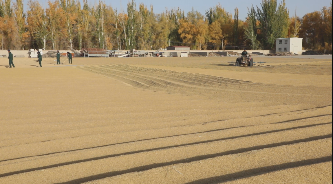 好大米不仅要种得好,还要加工得好。在阿拉尔市金色沙垦农业发展有限公司位于十一团花桥镇的大型晒场,铺满稻谷的晒场似一片金色的海洋。几台小型拖拉机在晒场上旋转,翻晒稻谷。稻谷晾晒是羊脂籽米后续加工的重要环节之一,利用阿拉尔晴好天气、适宜的光照,晾晒一周左右,去除水分,有助于提升稻米品质。