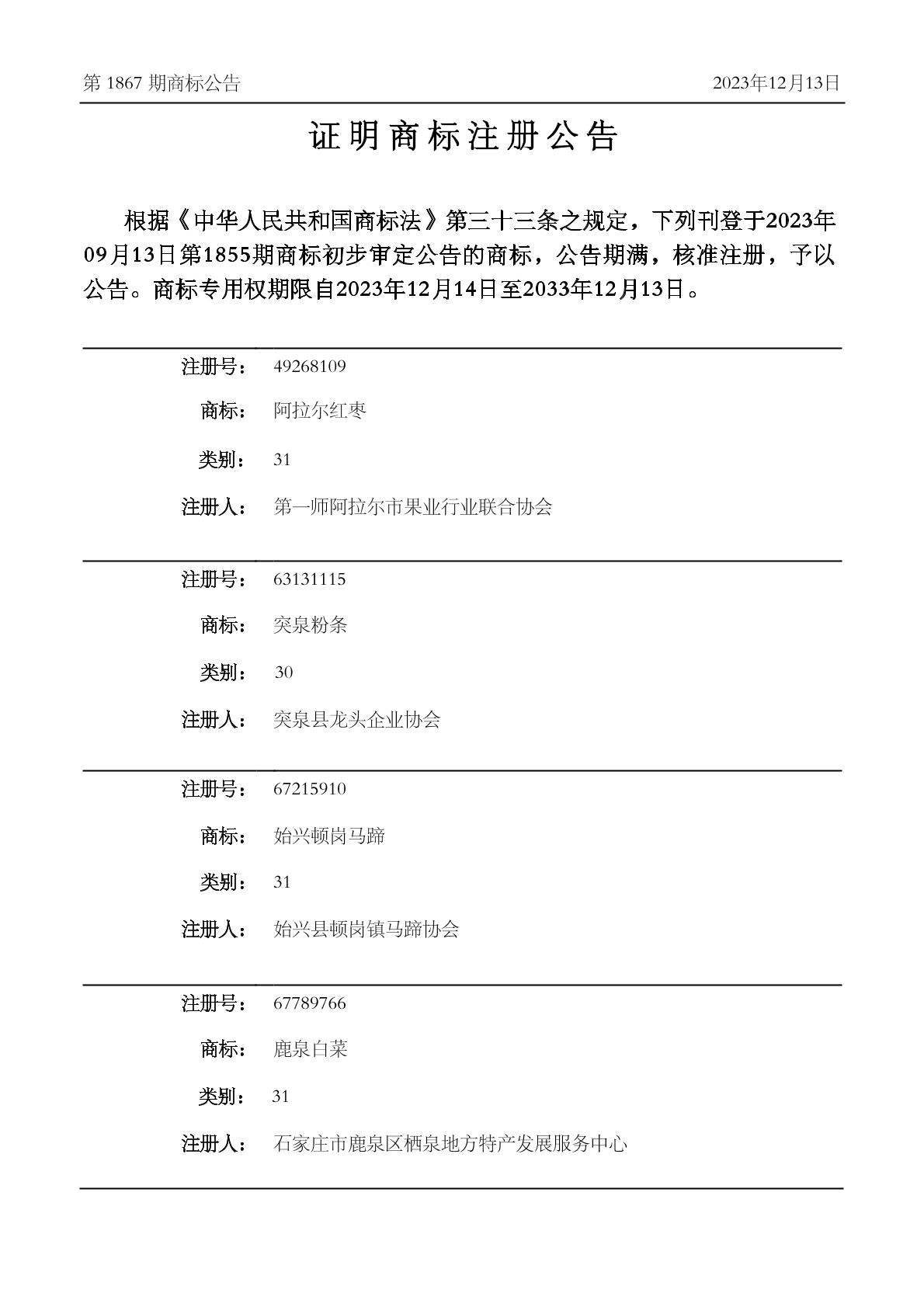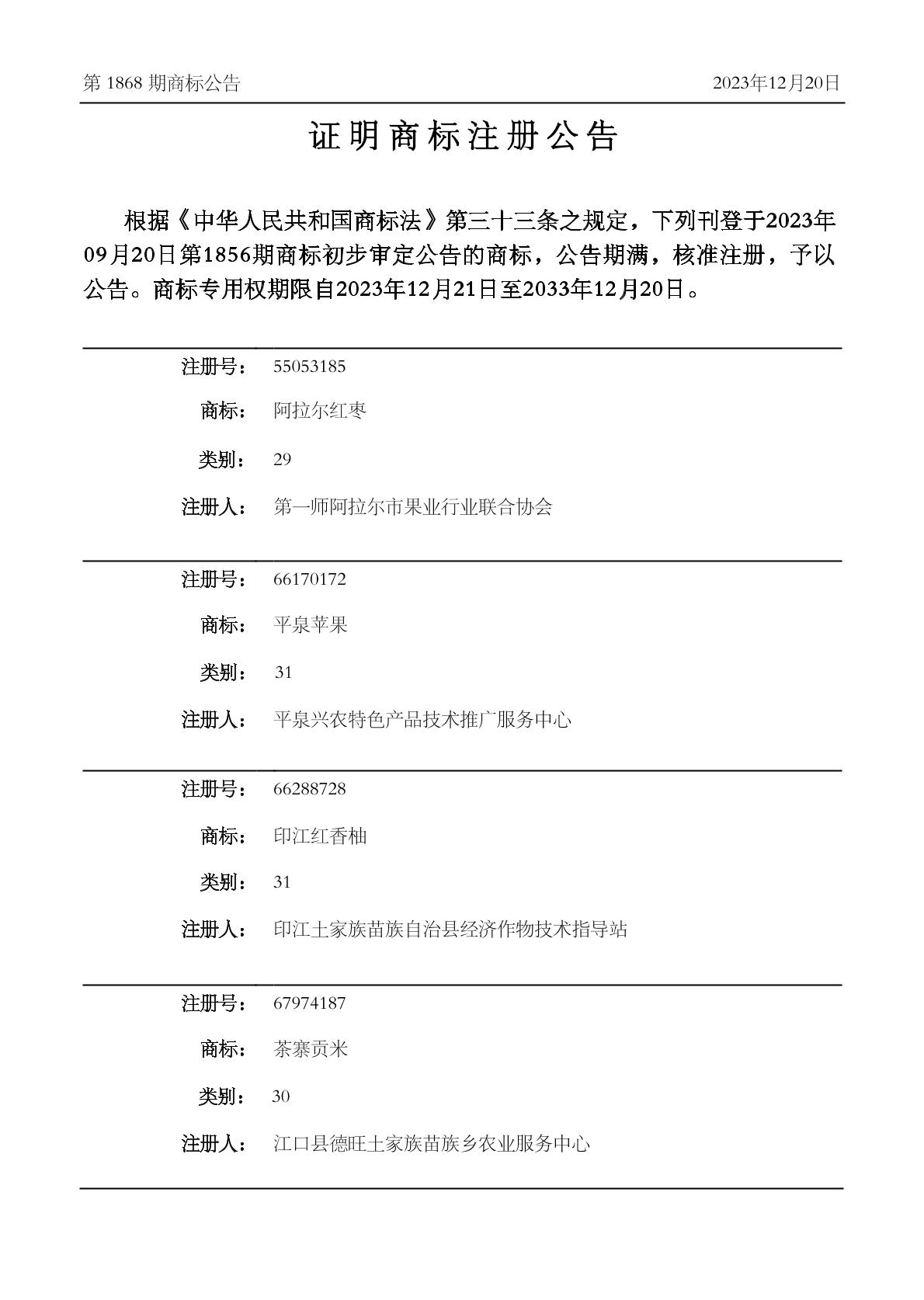 12月21日,记者从新疆生产建设兵团第一师阿拉尔市市场监督管理局获悉,根据国家知识产权局发布的第1867期、1868期商标公示,“阿拉尔红枣”第31类(鲜枣)、第29类(干枣)地理标志证明商标分别于2023年12月14日、12月21日核准注册,加上今年8月批准的“阿拉尔核桃”,阿拉尔市现行有效地理标志证明商标数量达到3个。