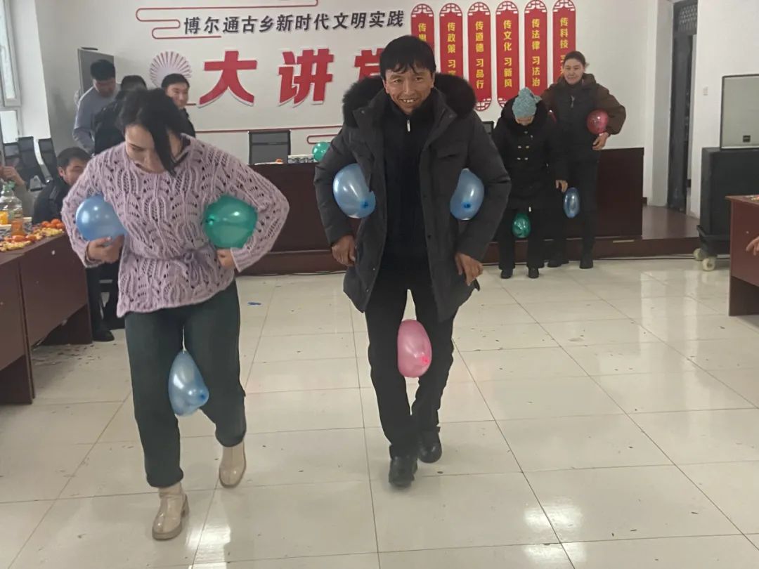 在加尔肯加尕村,“击鼓传花”游戏拉开了趣味活动的序幕,伴随着鼓声的响起,现场群众争先恐后的传递着气球,时不时地发出欢乐的笑声。紧接着“抢凳子”“运气球”等游戏吸引了大家踊跃参与,活动现场热闹非凡。