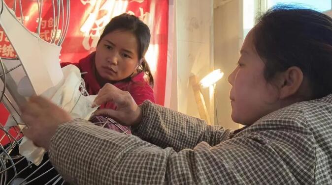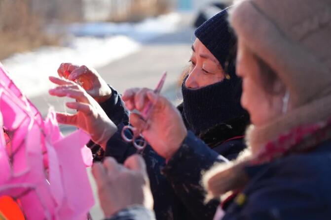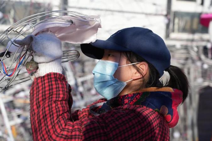 1月4日,在伊宁市东梁产业示范园的一栋厂房内,来自南京秦淮灯彩文化发展有限公司的扎灯艺人们正冒着严寒制作花灯。