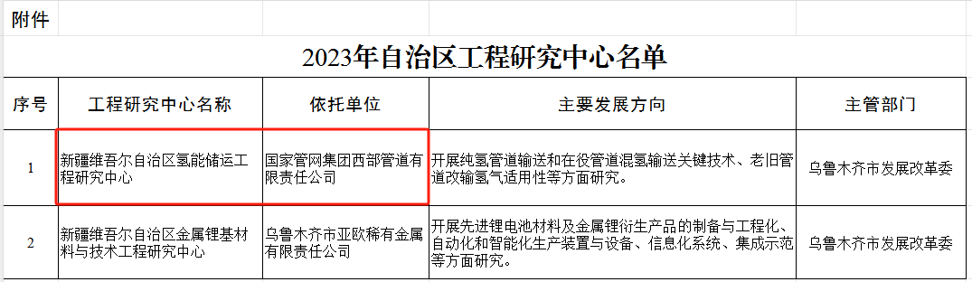 近日,新疆维吾尔自治区发展和改革委员会印发《关于2023年度自治区工程研究中心的批复》,西部管道公司申报的“新疆维吾尔自治区氢能储运工程研究中心”获自治区发改委批复认定。这是西部管道公司自治区级工程研究中心的首次突破,是在科技创新方面助推西部管道公司高质量发展的又一重要体现。