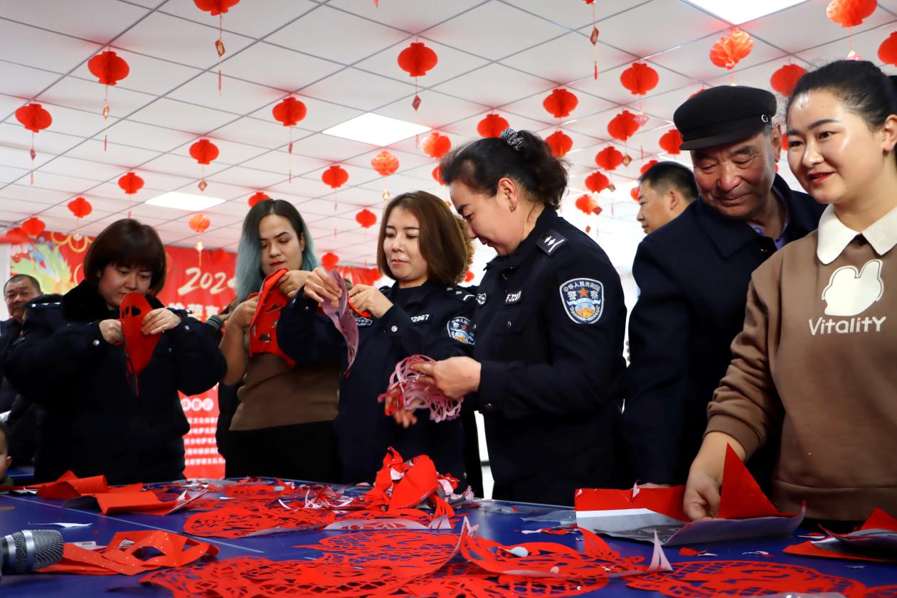 图为派出所民辅警与辖区群众共同创作剪纸艺术作品。佘佳宁 摄