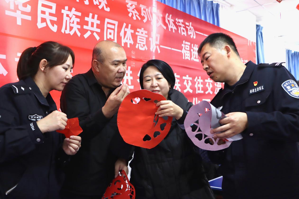 图为派出所教导员(右一)、访惠聚第一书记(右二)与辖区群众共同创作剪纸艺术作品。佘佳宁 摄