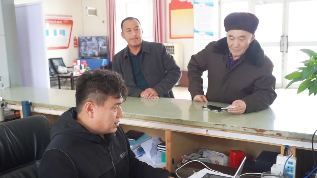 走进沙湾市大泉乡三道沟村便民服务站内,在医保窗口,帮办代办员叶力包拉提·铁木尔拜正在给村民陈建中讲解异地就医备案登记。