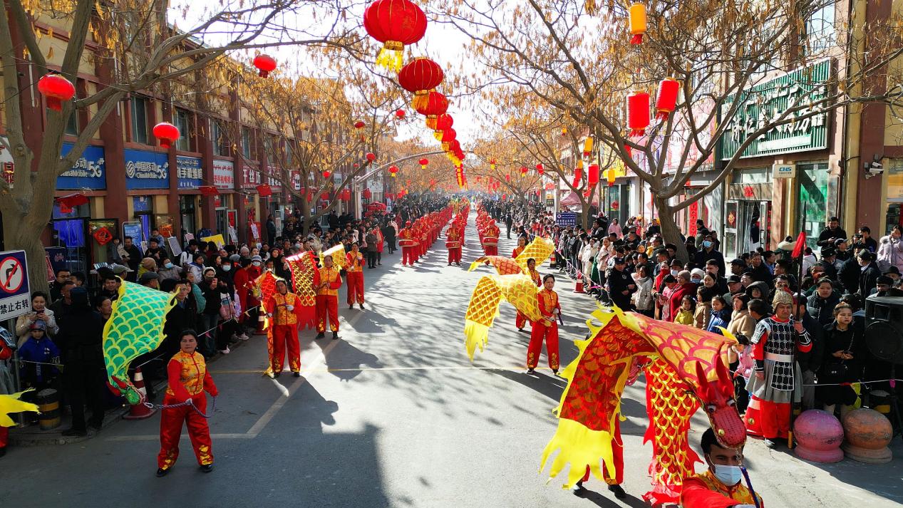 社火表演现场,伴着铿锵的锣鼓声两条金色的祥龙时而蜿蜒、时而翻腾,灵动自如,仿佛穿梭云中,非常壮观;威武的雄狮滚动起舞,活灵活现,威武勇猛;整齐划一的秧歌队踩着十字步,翩翩起舞......此次社火活动还表演了京剧、彩绸舞、扇子舞、踩高跷、腰鼓舞、非遗乐器演奏等,同时还融入了当地民间传统婚礼马车习俗表演,使人耳目一新,让广大居民群众在欢乐的节日氛围中感受中华传统文化的魅力。