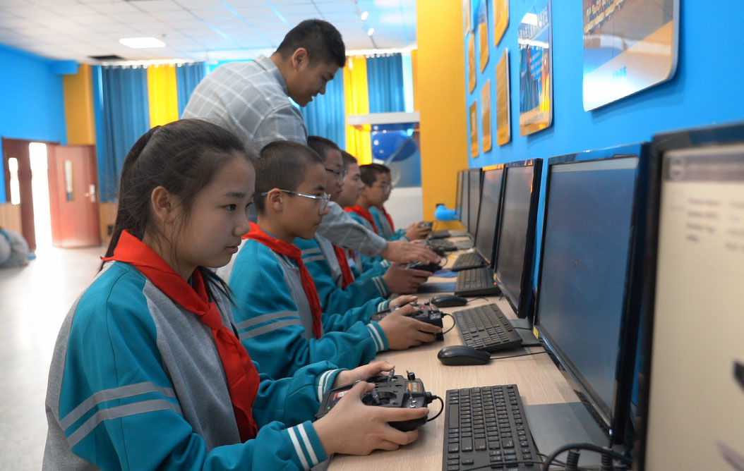 4月1日,在新疆二师二十九团孔雀中学的创客教室,航模、编程无人机、3D打印机等各式教学设备一应俱全。在老师的指导下,学生们正在电脑上用虚拟飞行软件模拟真实的飞行操作,并尝试用3D打印机打印课堂作品。