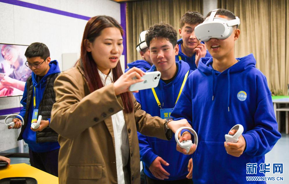 4月15日,参加春令营的来华青年学生在新疆师范大学学生(左二)的引导下体验VR等设施。