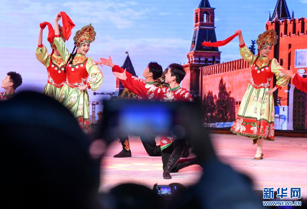 4月15日,参加春令营的来华青年学生(左三)与新疆师范大学学生在开营仪式表演结束后合影。