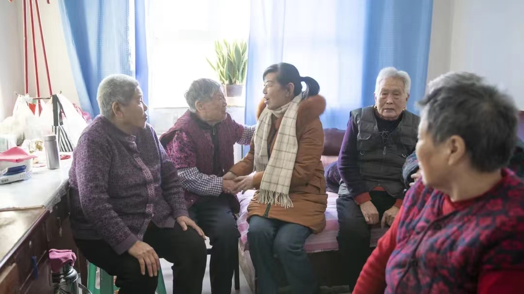 把老人的食谱送到食堂工作人员手中后,周国荣又来到曾太俊老人的房间,准备帮她收拾床铺,再陪她聊聊天,不一会儿,曾太俊老人的房间里就聚满了人,欢声笑语不断。