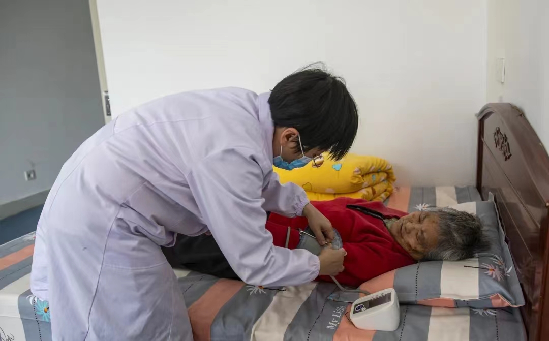 二十二团医院工作人员正在为老人测量血压。魏怀娟 摄