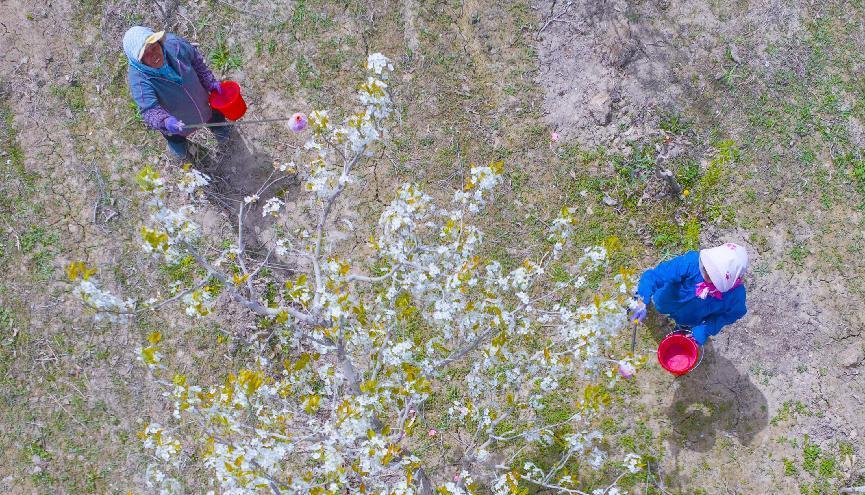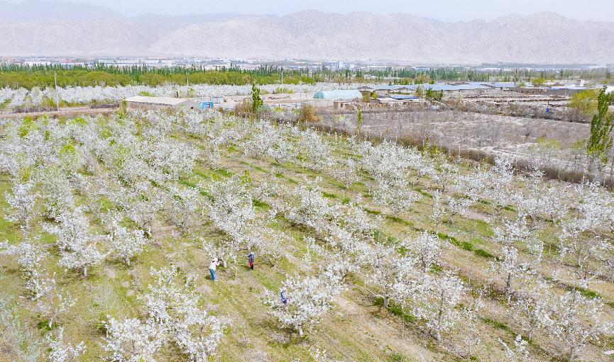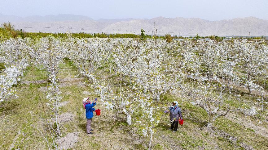 4月16日,在二十九团十连职工盛恩光的梨园里,雪白的梨花成片开放,花香四溢,美不胜收。梨园上空,一台无人机正在执行液体授粉作业,演绎智慧农业种植新模式。