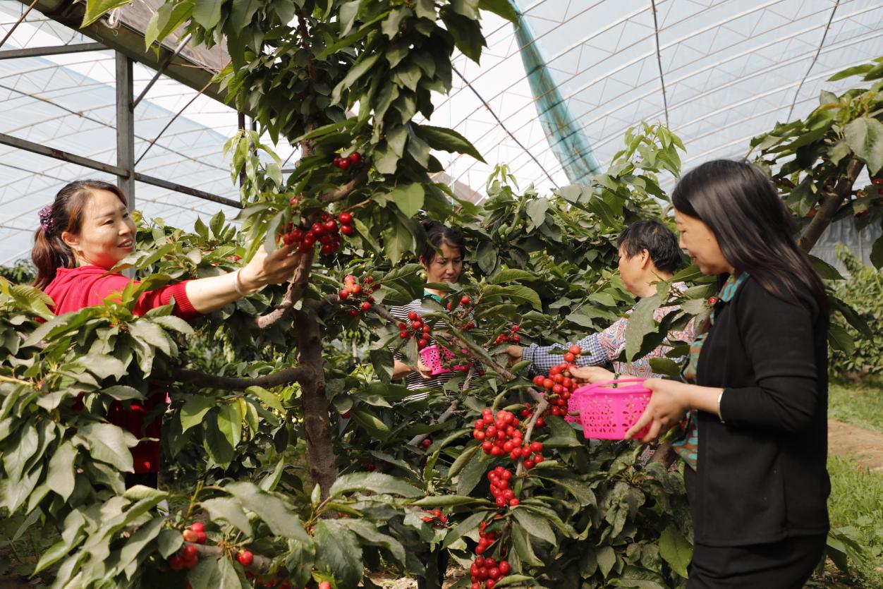 为实现错峰成熟,基地内共栽植了美早、红灯、砂蜜豆等多个品种,经过6年时间的管护,这些樱桃树从去年开始挂果,今年进入丰产期。鲜嫩的水果不仅实现了“南果北种”,也让沙漠边缘的群众在树下尝到了鲜。