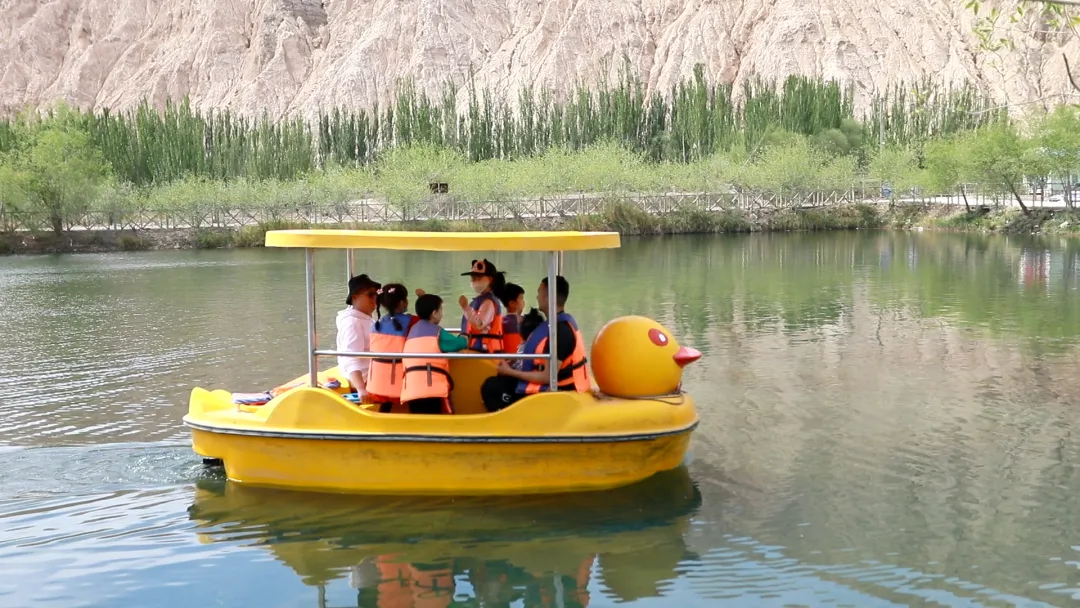 疏附县木什乡明尧勒村河滩农家乐里,游客正在游船。疏附县融媒体中心供图