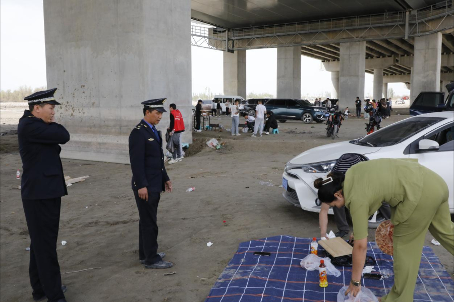 在塔里木河大桥桥底,第一师城市管理综合行政执法支队执法人员现场办公,劝导游客保护环境。乔建林 摄