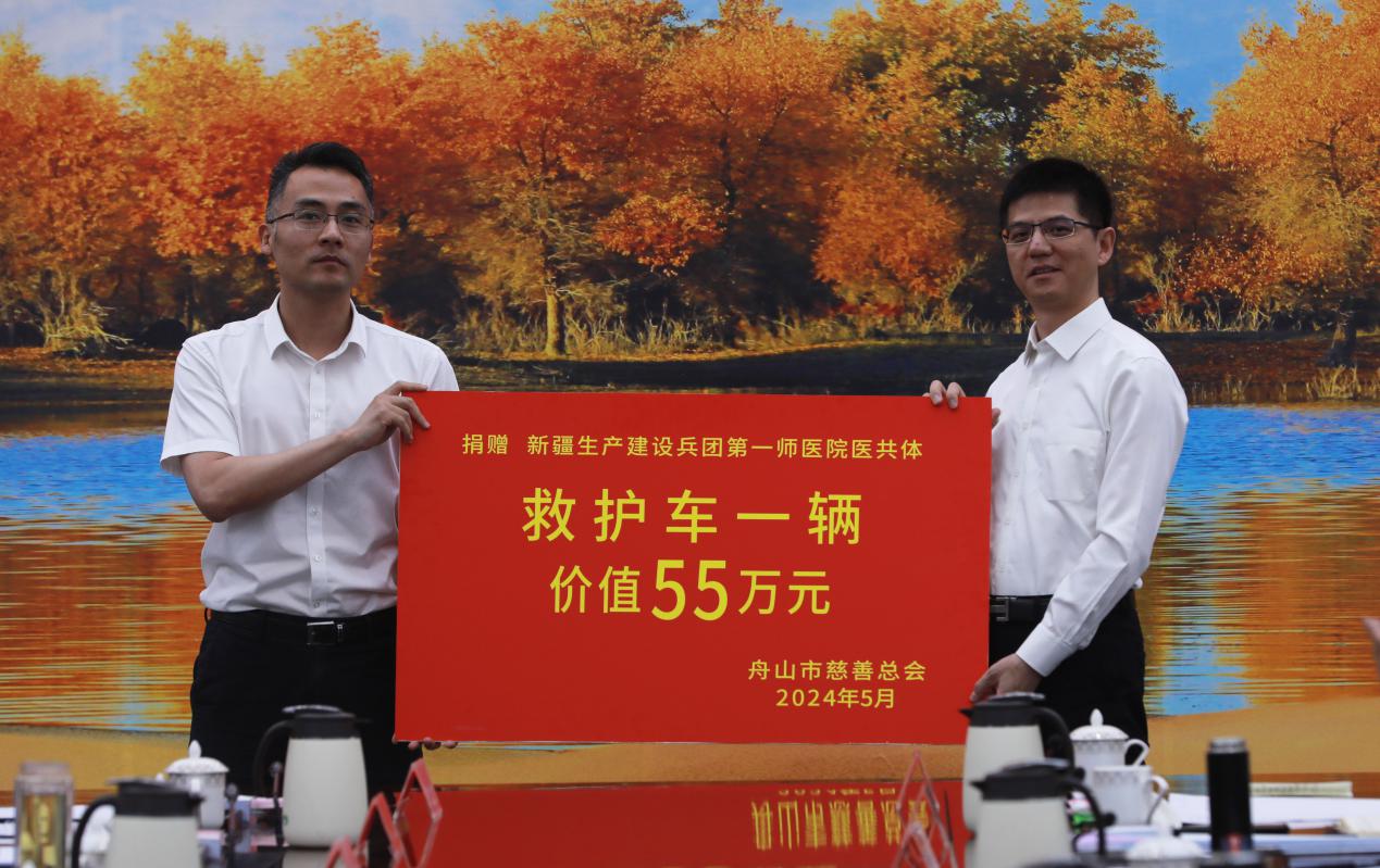 当天,浙江省杭州市、宁波市、绍兴市、金华市、台州市卫生健康委代表分别与对口支援团场医院负责人签订了“组团式”帮扶协议。舟山市慈善总会向第一师医院医共体捐赠了一辆价值55万元的救护车。