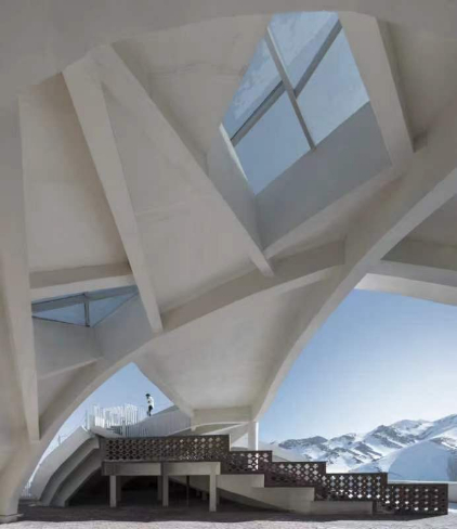 如果说以上所讲的三栋建筑是“打着领带的建筑”的话,那么位于距乌鲁木齐市30多公里南山托里乡的“东庄建筑馆”则应称之为“休闲式建筑”了。对这栋建筑我并不陌生,因为2014年当我开车拉着家人游玩路过那里时,就感觉这栋建筑很别致,像个大飞艇悬浮在山脚下,后来才知道这栋建筑原来是刘谞的作品。为了一探其究竟,2024年的五一小长假,我心血来潮地约上两个朋友前往参观。原来这栋建筑的前身是六十多年前盖的荒芜粮店。基于草木不再受损害考虑,建筑馆在原有基地上搭建,坐北望城、朝南近山。远远望去像是从山上滚下来的一块灰白石头,既不碍眼也不张狂,安妥地立于蓝天烈日、沙漠戈壁、亚欧腹地的旷瀚地域,全然没有城市建筑的炫丽、秩序和教化。从山里下来的河沟两侧是哈萨克族牧民世代冬暖夏凉的“转场窝子”,建筑馆被动地贴着草地,牛羊时不时地“闯入”院内,转一圈纳会儿凉。老乡们走累了、孩子们放学了也会进去休憩、嬉闹一会儿,村里的人叫它“洋毡房”。厚墙、小窗既能抵御烈日的辐射,又为漫长冬季的保暖创造了条件。水泥、沙子,不得不用的钢筋和尽可能少用的玻璃,构成了建筑的整个空间,用传统技术空心墙、干打垒、土坯、石块砌筑的原理和方法来构筑牢靠、简单和实用的建筑。关注材料本身的肌理来展现表皮、非既定的空间,尊重数据框架生态循环体系的设计,体现出当地生活的多样性、随意性、模糊性,并赋予其自由、自在以及自生的动力。整个建筑是个“透明体”,内部含糊楼层概念,具有不确定的多种与多重适用的可能性,空间组织上下左右互通互联,并与自然环境形成顺风雪、挡风雪的形体流线以及采光、通风的有机利用,与外部空间“凹凸”镶嵌的契合,按需凿琢挖出来原有的和“创造”的空间并被劳作者使用,这样的设计理念和精心挑选的建筑材料,既是对生态环境的保护也是对资源的尊重。置身其中,给人一种空间布局新颖,结构布置合理,设施功能齐备,耳目一新之感。随行的朋友说,将来退休后能住在这儿读读书,每天在山下转悠转悠,与大自然为邻该多好呀!从该建筑时常出现在刘谞朋友圈的频次来看,可以说这栋建筑应该是刘谞的最爱。不难想象,作为一名建筑师,一生能随心所欲地创作出自己心仪的作品,并把它变成看得见、摸得着的实实在在的建筑实物,是不容易实现的。而这一切都源于刘谞对建筑设计的痴爱和对建筑艺术的不懈追求,所以他才“捧着一颗心去创作”,而且在这六分之一的国土上创作出了数百篇的作品,职业素养令人感动。