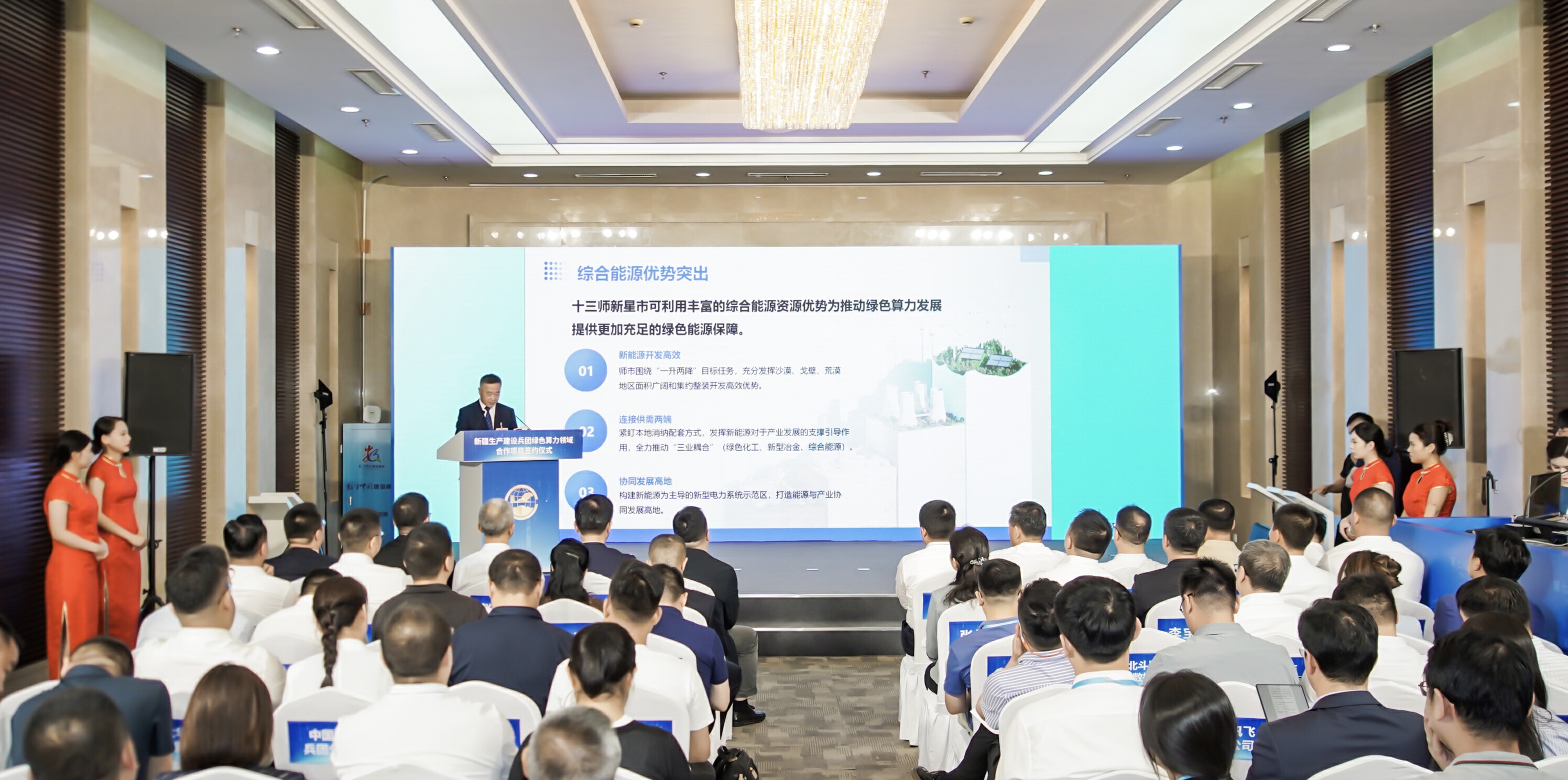 活动现场,八师石河子市、十三师新星市先后进行了绿色算力产业发展专场推介,详细介绍了各自交通区位、气候条件、综合能源、产业发展、营商环境等方面优势。八师石河子市气候干燥冷凉,区域电网独立运行,电力供应充足,可为算力中心建设提供稳定、可靠、低价的绿色能源。十三师新星市光能、风能条件得天独厚,规划了千万千瓦级的风电基地和千万千瓦级的光伏基地,近年来借助资源优势,大力推进融合算力中心招商。