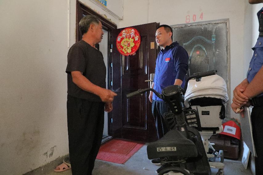 向居民宣传楼道违规停车的危害性。阿迪力·艾尼摄