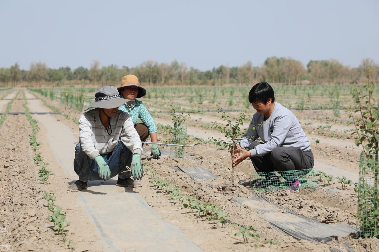 “今年栽种的这些实生苗成活率很高,采取芽接效果更好。”谢小云蹲在一排树苗前,和傅正雄聊起给树苗嫁接问题。“枝接容易生病,成活率在80%以上。如果芽接的话,嫁接部位高,不容易生病。成活后,枝条可以长到50公分至1米的长度,再者伤口小,不易被风沙刮断,成活率达95%以上。”