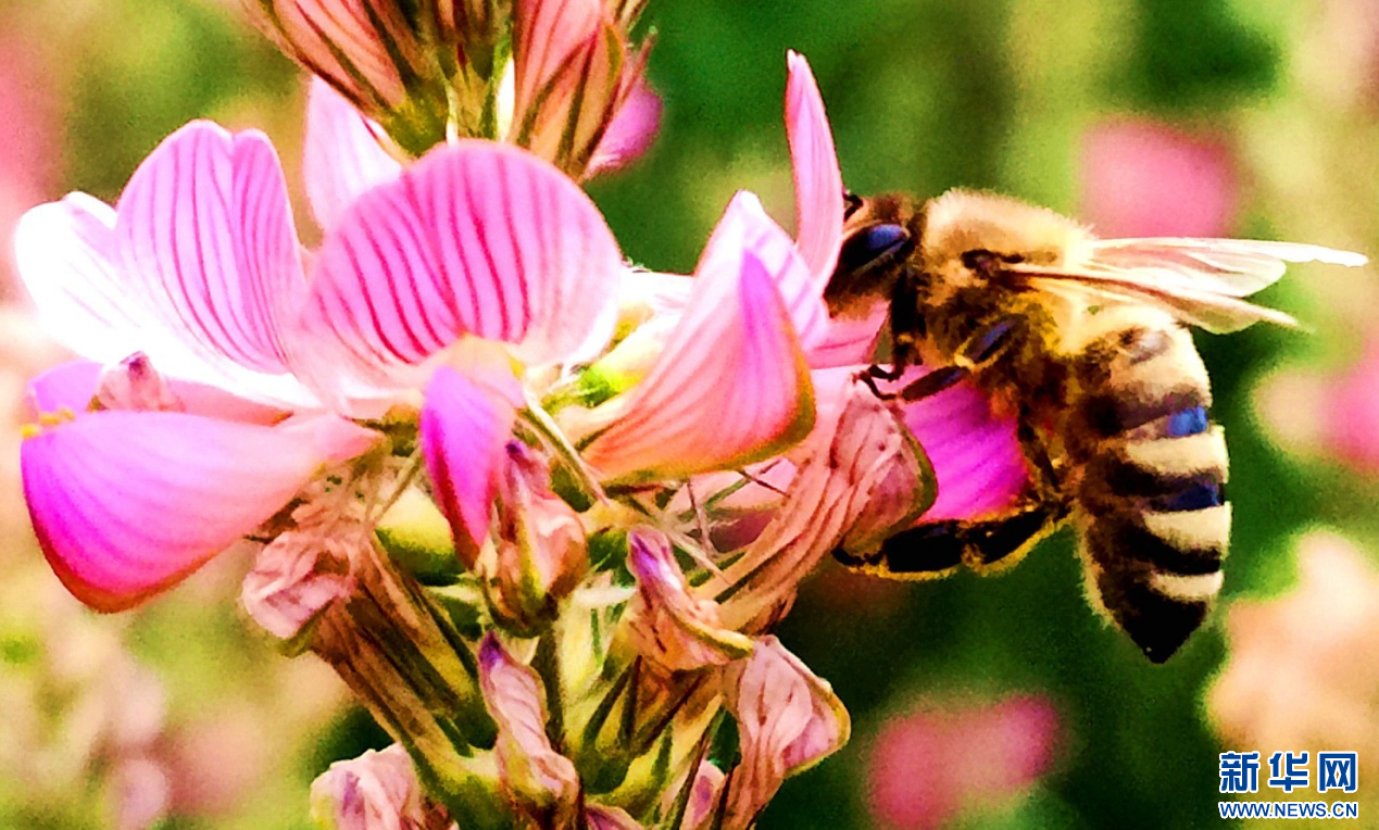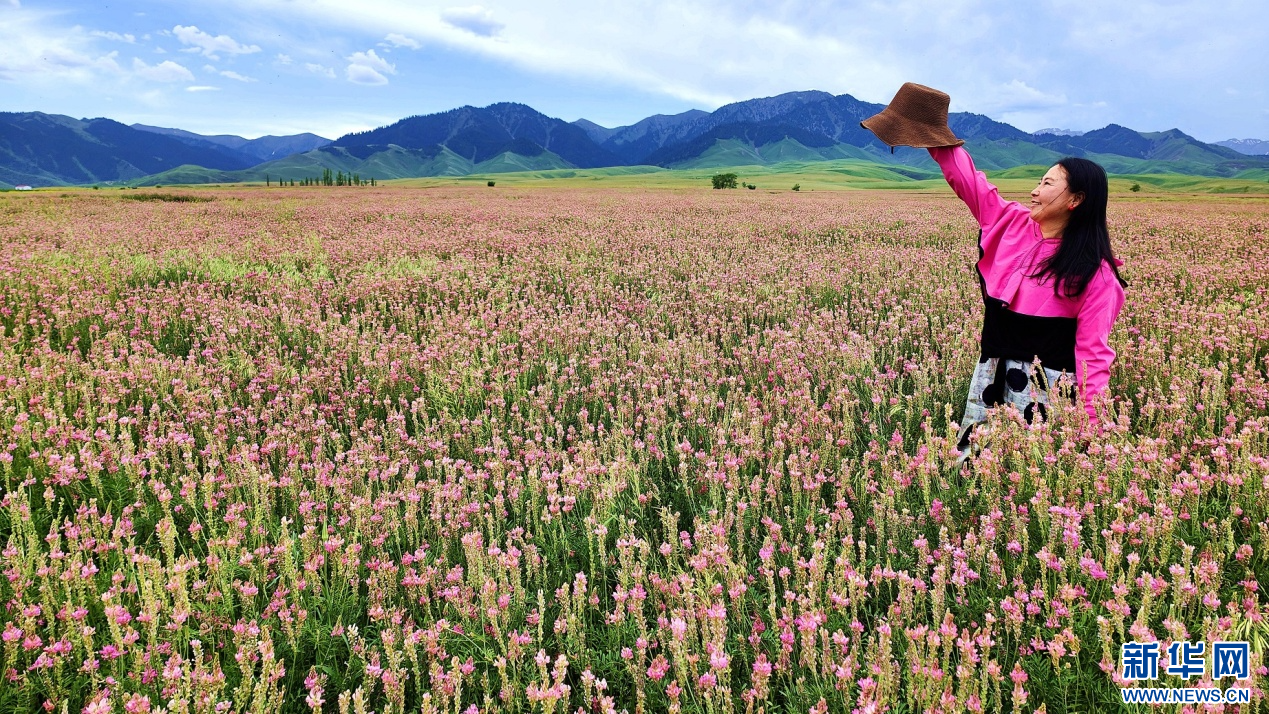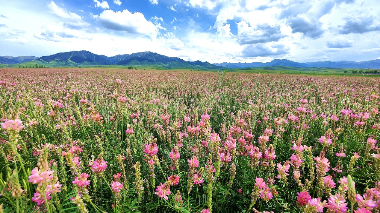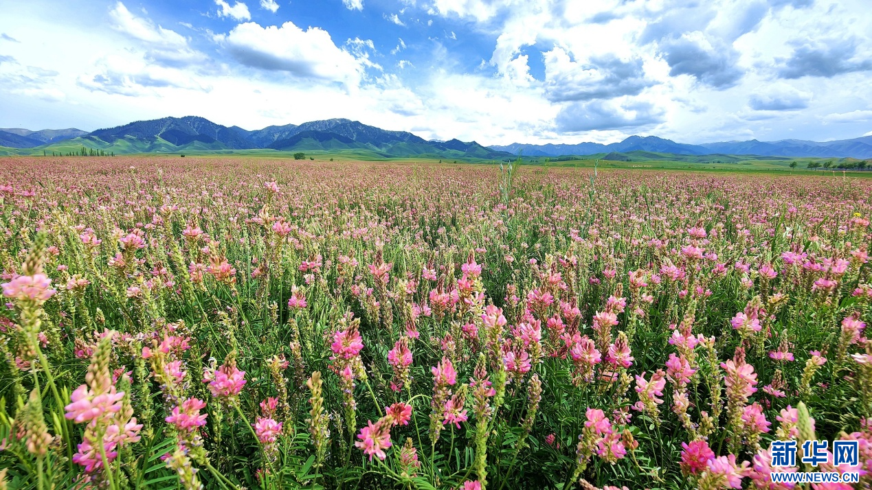 近日,在新疆伊犁哈萨克自治州察布查尔锡伯自治县琼博拉镇克其克博拉村红豆草种植基地,一片片种植的红豆草花朵盛开,一串串花蕾随风摇曳,在大山、蓝天、白云的映衬下形成优美的“红色花海”。