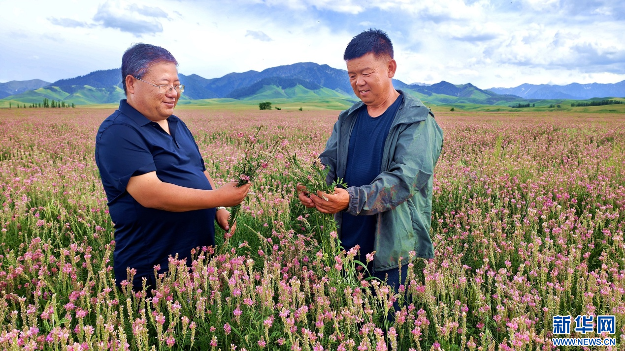 6月12日,乌孙山脚下红豆草满地绽放“致富花”,形成“红色花海”。华岩明摄