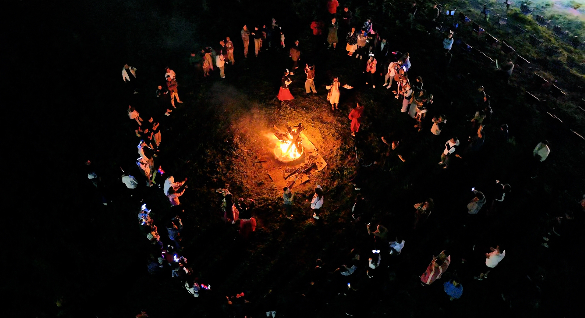 图为6月18日晚,天山托木尔景区塔村举办篝火晚会,各地游客与当地群众一起载歌载舞。罗昭 摄