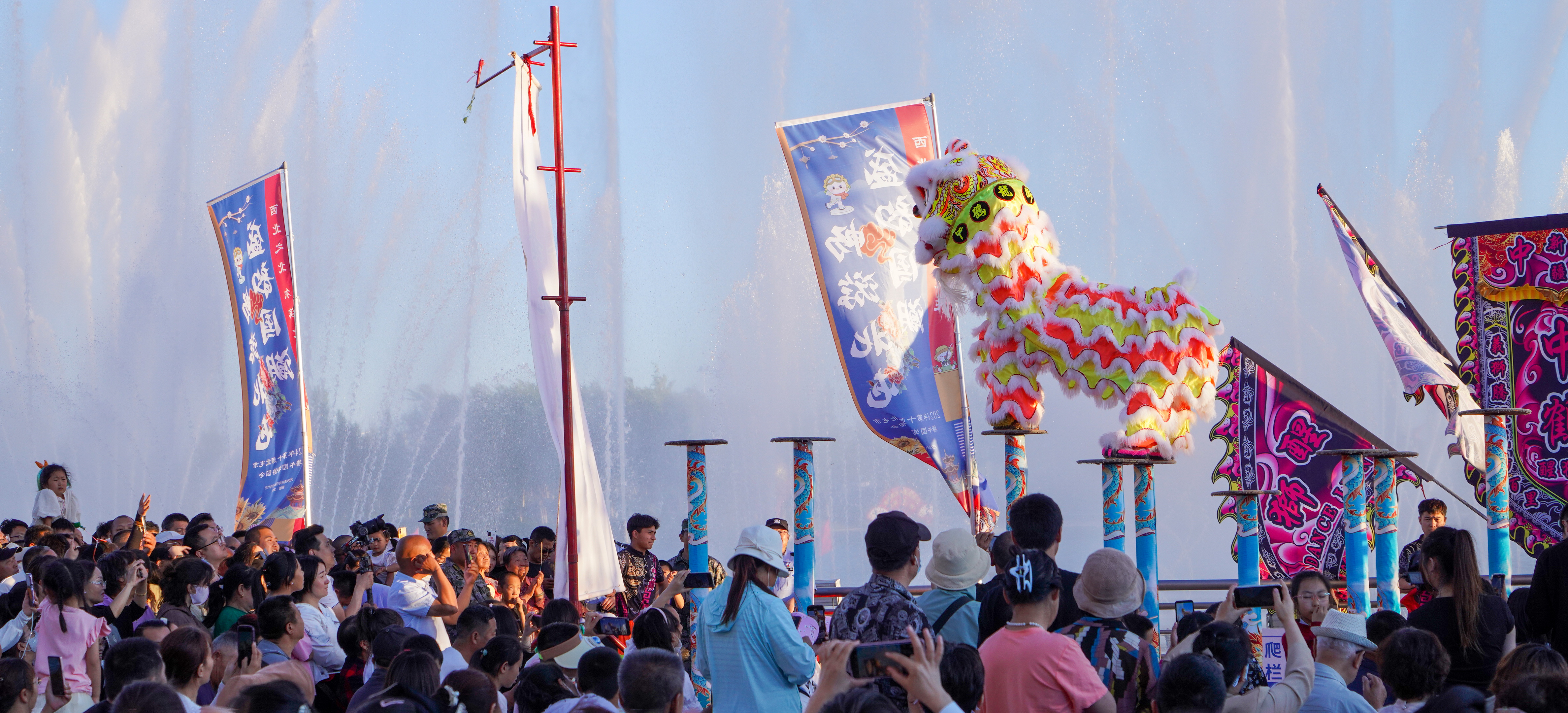 6月10日,在十师北屯市端午国潮游园会上,游客在欣赏舞狮表演。