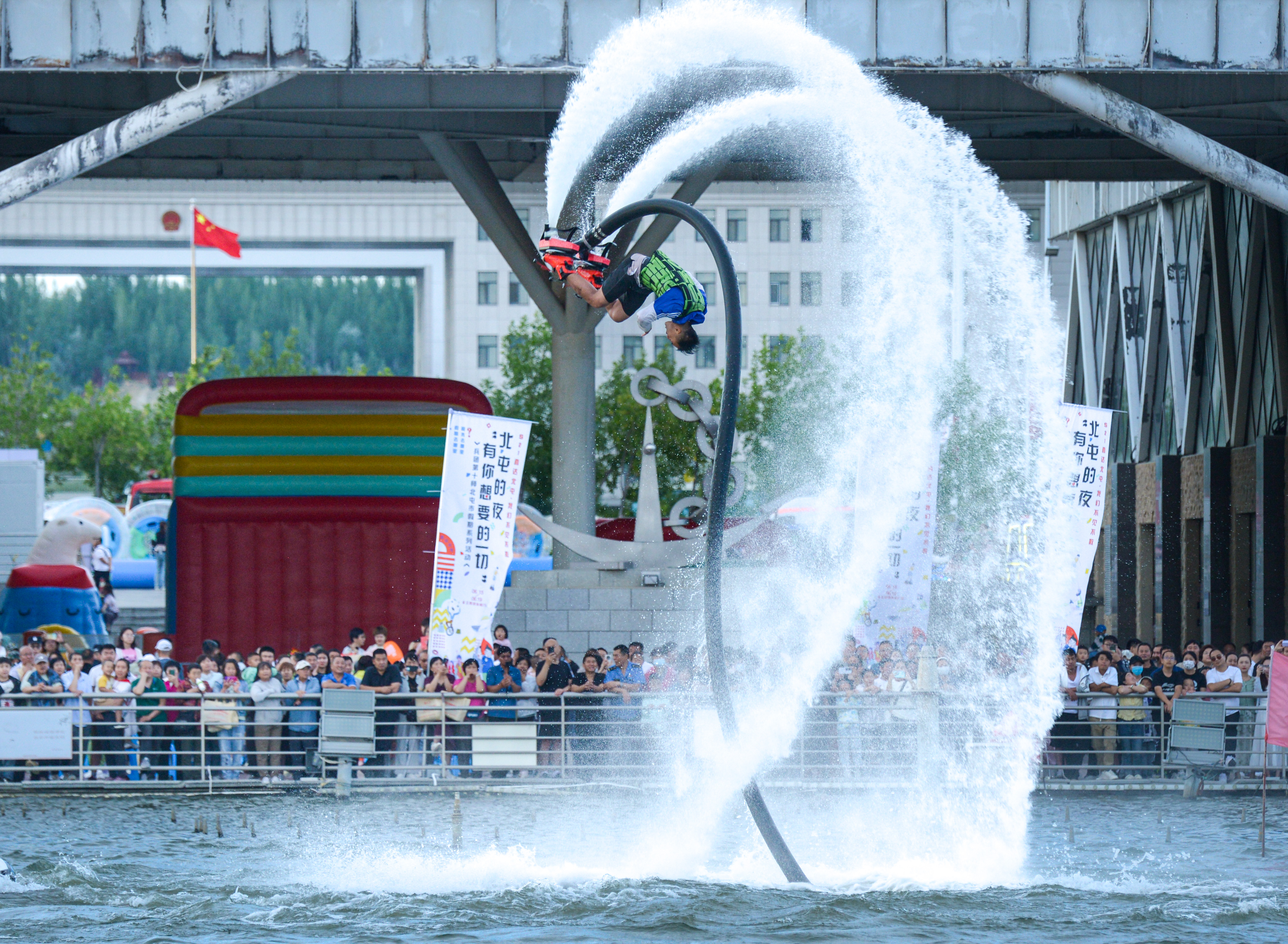 6月17日,在十师北屯市玉带河景区,表演者向游客展示水上飞龙表演。