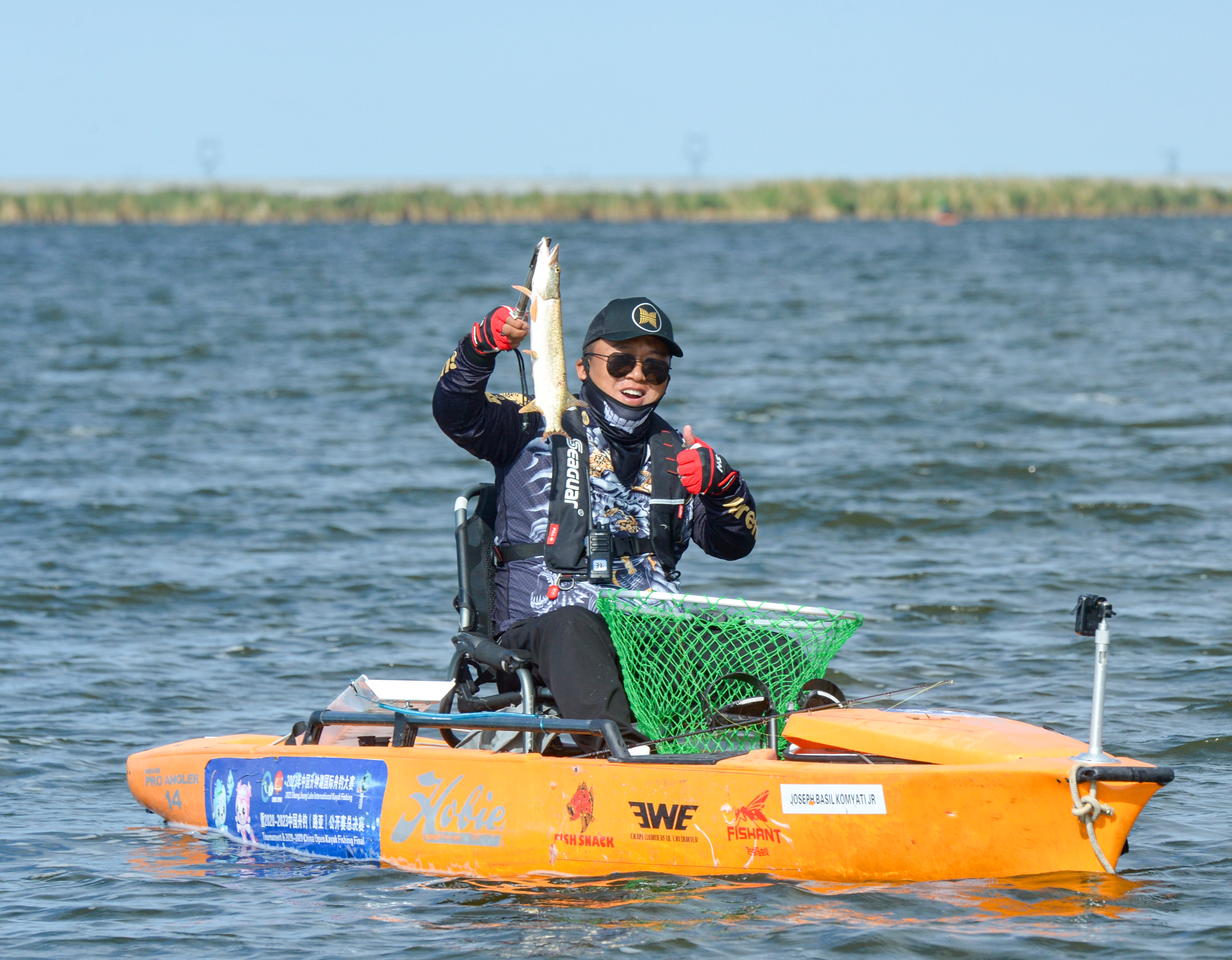 6月17日,在十师一八三团向阳湖国际钓鱼运动基地,选手展示垂钓的狗鱼。