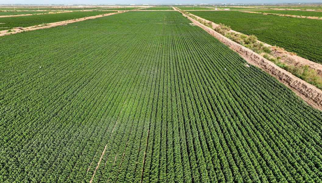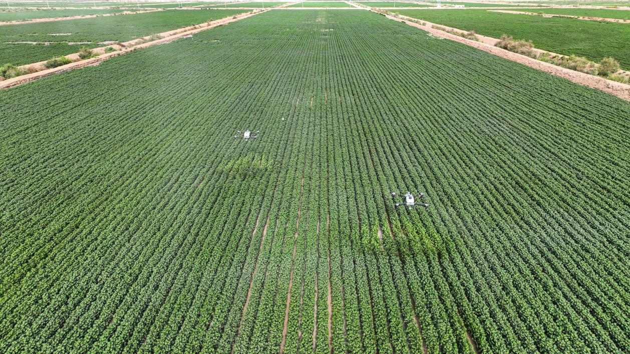 从高空俯瞰,绿色的棉田被一条条排碱渠分割开来,犹如一块块绿毯平铺在大地上。时下正是棉花初花期,为保证坐桃率,职工们正在利用无人植保机喷施叶面硼肥。