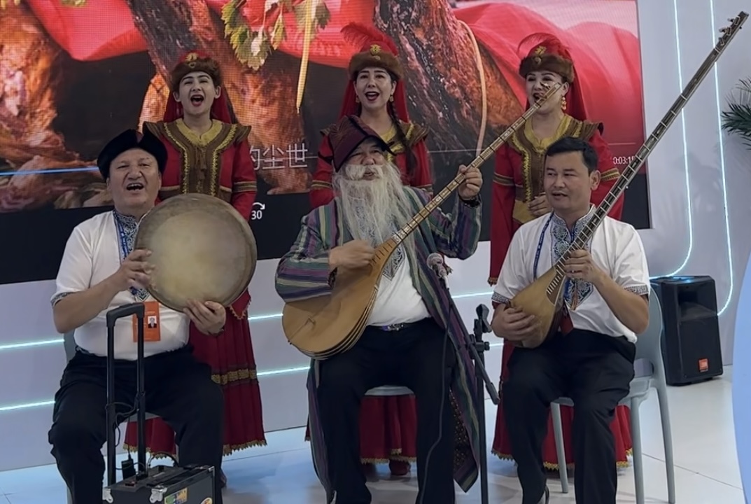 “沙漠绿洲好地方,请到罗布淖尔来一趟……天堂美景好风光,好风光,请到罗布淖尔来一趟。”伴随着一曲来自巴州尉犁县罗布人的优美歌舞,巴州展馆吸引了无数客商驻足观看。