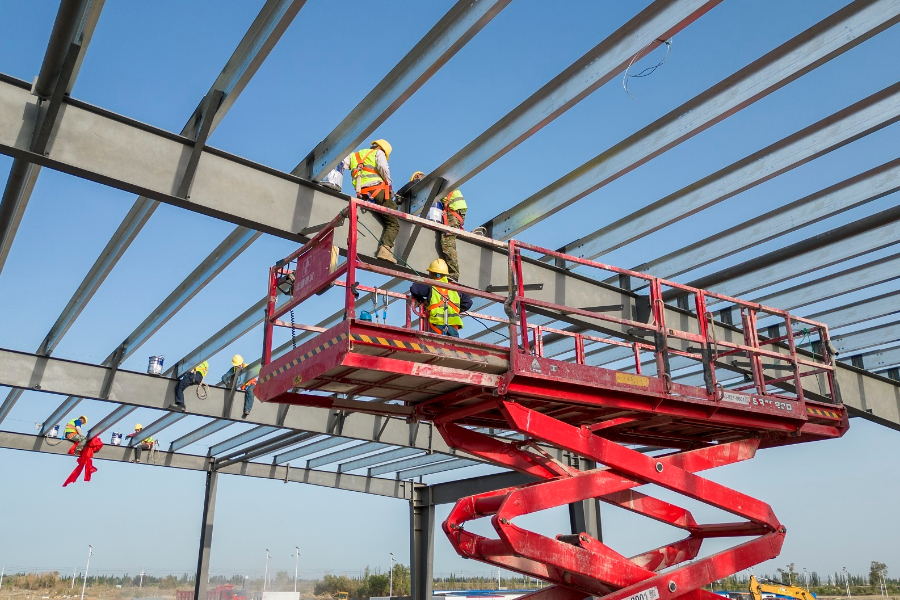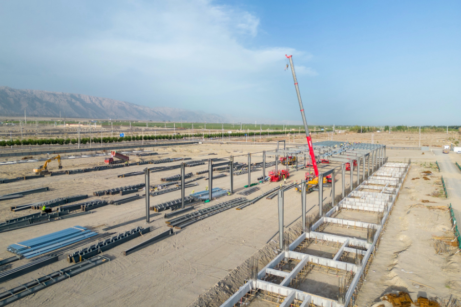 在新疆九色鹿纺织有限公司项目建设现场,施工人员正在进行纺纱车间钢结构施工。苏江生 摄