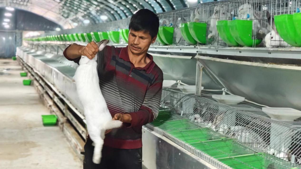 阿拉尔市建飞农业发展有限公司负责人谢培忠说:“肉兔品种主要是从法国引进来的伊拉和伊普吕,这个品种的肉兔繁殖能力强、生长速度快,从出生到出栏,60天就可以销售了。我们在阿拉尔都有固定的客户,主要是学校食堂、市场、酒店,还有其他地方的客户也在这里采购。”