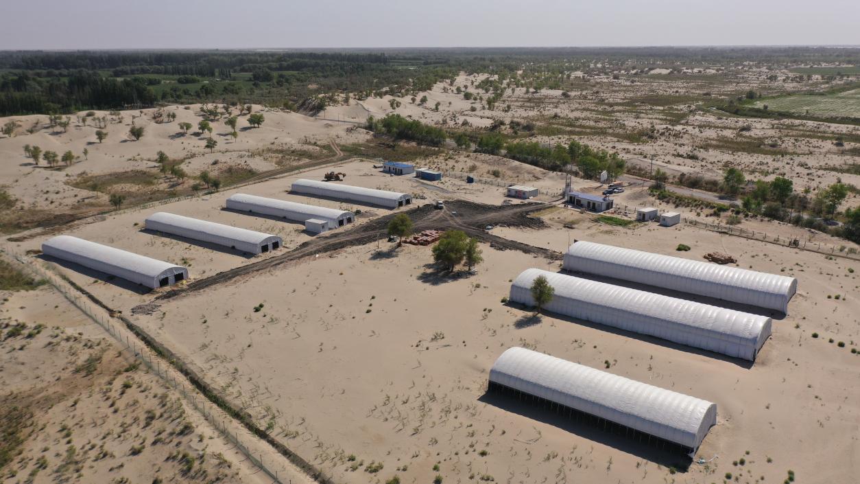 一座座白色恒温肉兔养殖大棚整齐排列在沙漠中。陈皓 摄