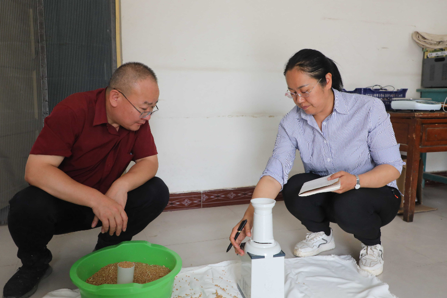 专家组成员随机抽取麦粒,测量千粒重。林国强摄