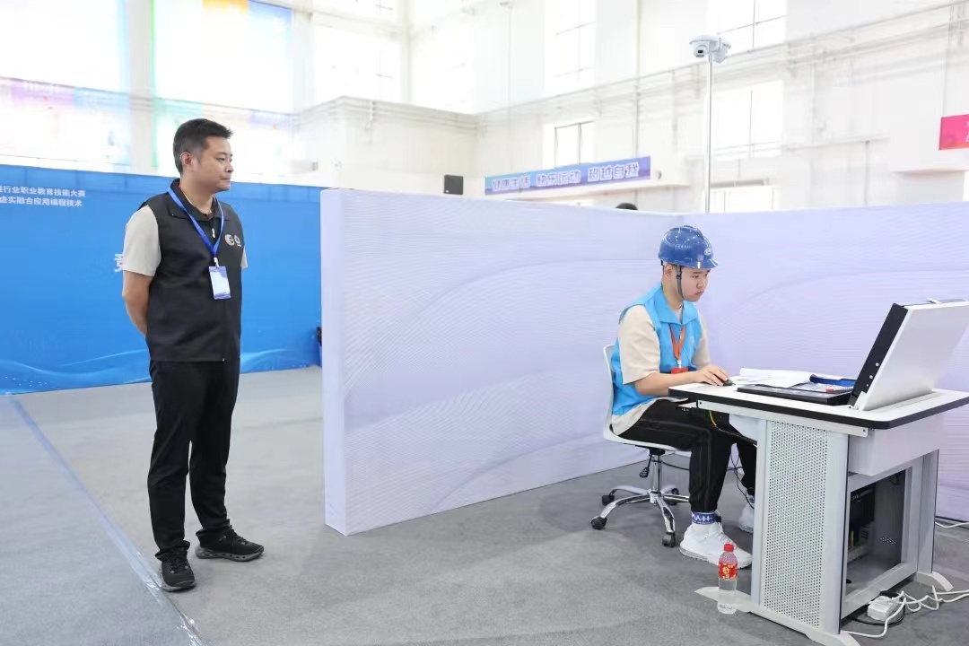 工业机器人虚实融合应用编程技术赛项裁判长于建明说:“本次大赛所执裁的裁判均具有丰富的职业技能经验、执裁经验,为公平、公正地评分提供了保障。”