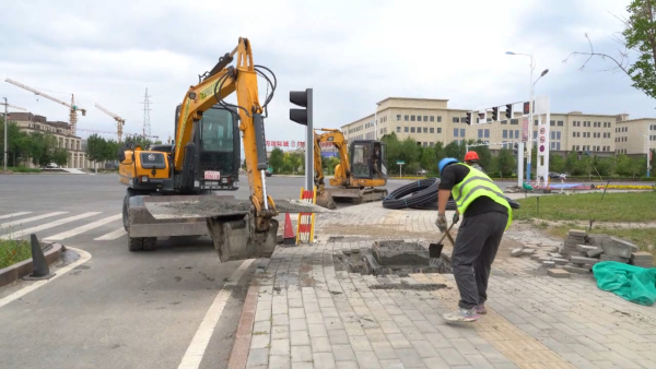 7月2日,记者在沙湾市迎宾北路与福州路交汇路口处看到,工人们在挖机的配合下,正紧张有序地开展施工作业,现场一派繁忙景象。